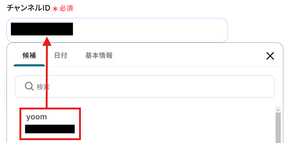 「チャンネルID」欄をクリックすると、連携しているアカウントから候補が表示されるので、該当のチャンネルを選択しましょう。