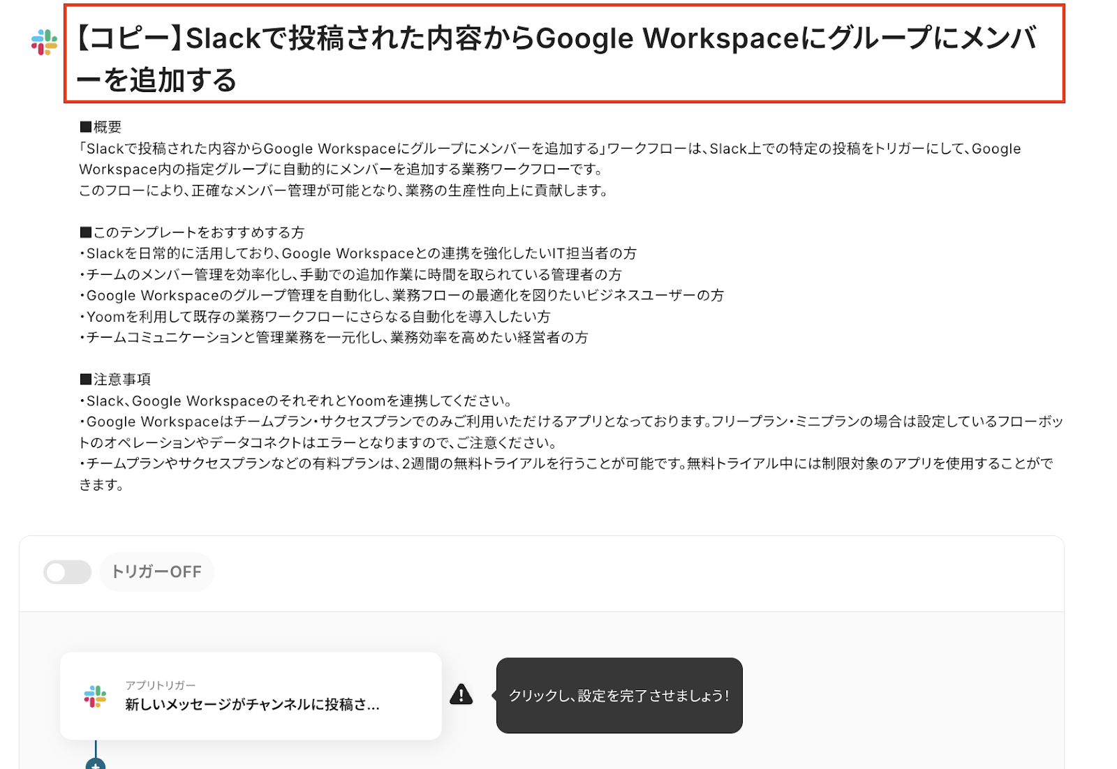 Yoomを利用することで、ノーコードで簡単にSlackとGoogle Workspaceの連携が可能です。YoomにはあらかじめSlackとGoogle Workspaceを連携するためのテンプレートが用意されているため、APIの知識が無くても、登録するだけで今すぐ連携が実現できます。 ■概要 Slackでメンバー追加の依頼があった際、都度Google Workspaceを開いて手作業でメンバーを追加するのは手間がかかり、他の業務を圧迫することもあるのではないでしょうか。また、手作業による対応は、追加先のグループ間違いやメールアドレスの入力ミスといったヒューマンエラーの原因にもなります。このワークフローを活用すれば、Slackの特定チャンネルへの投稿をきっかけに、自動でGoogle Workspaceのグループへメンバーを追加し、こうした課題を解消します。 ■このテンプレートをおすすめする方 ■このテンプレートを使うメリット ■フローボットの流れ ■このワークフローのカスタムポイント