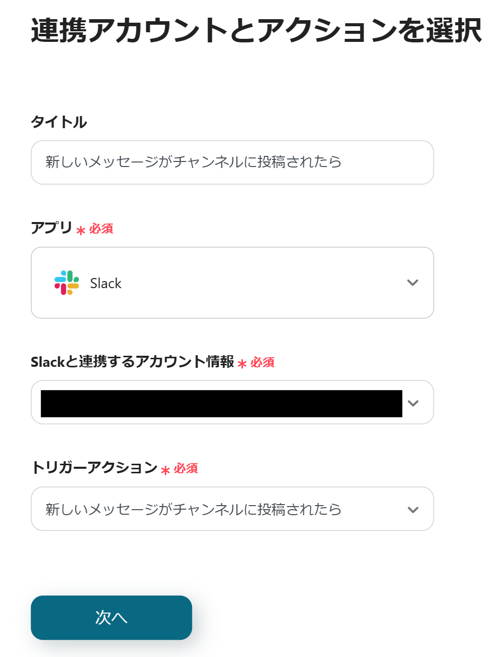 連携するアカウント情報にはステップ1でマイアプリ登録した際の情報が記載されます。アクションはそのままにし、「次へ」をクリックしましょう。