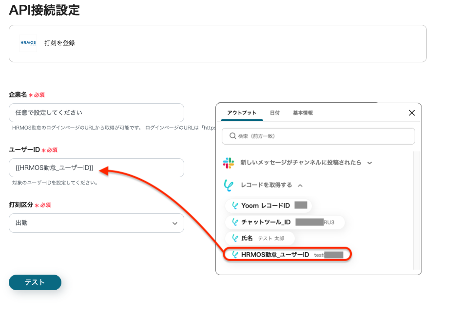 「ユーザーID」は、欄をクリックしてYoomのデータベースから取得したHRMOS勤怠のユーザーIDを選択します。