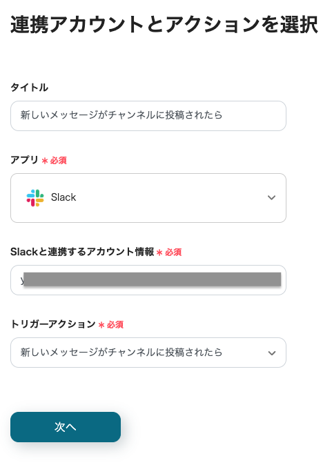次に、Slackと連携するアカウント情報を確認してください。タイトルは自由に編集できますが、トリガーアクションはそのままにして、「次へ」をクリックしてください。