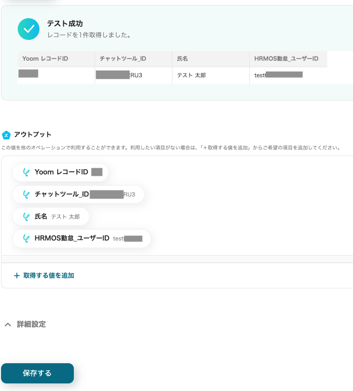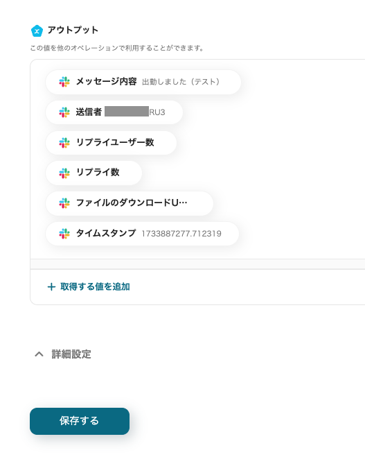 アウトプットに表示されている取得情報を確認して、「保存する」をクリックしましょう。