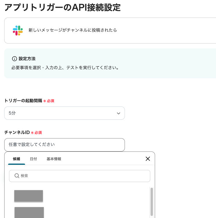 「チャンネルID」は、欄をクリックすると表示される候補から該当チャンネルを選択してください。
