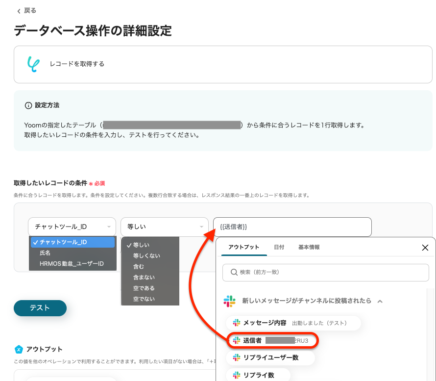 今回は画像のように「データベースに保存されているチャットツールIDとメッセージ送信者のIDが等しい」という条件を設定しました。