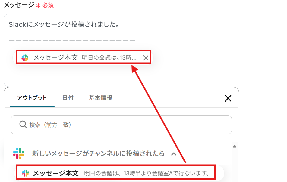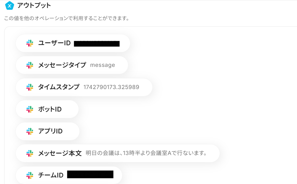 このアウトプットをこのあとのアクション設定時に引用することで、SlackとLINE WORKSのデータ連携を実現していきます!