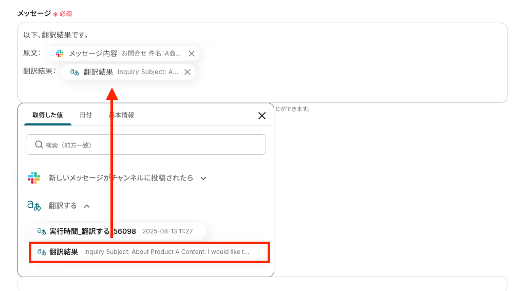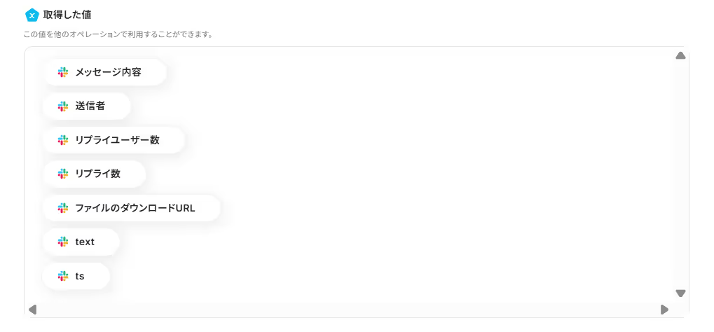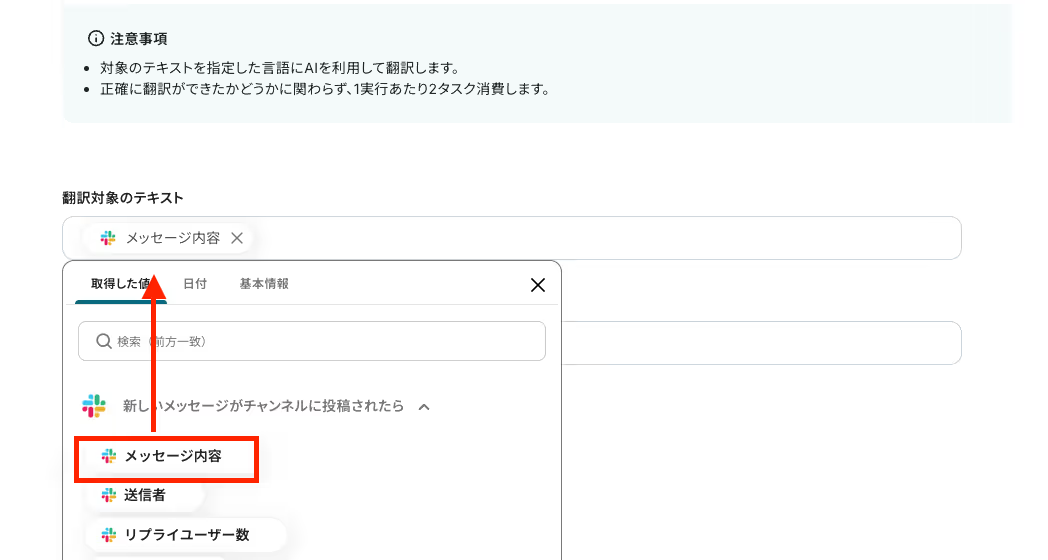 AI機能で設定するプロンプトは、「以下の文章を要約して」「決定事項とToDoを抽出して」など、目的に合わせて自由にカスタマイズできます。 Slackでメッセージを送るアクションでは、通知先をスレッドではなく別のチャンネルに指定したり、メッセージ本文に固定のテキストや前段のオペレーションで取得した情報を変数として埋め込むといった設定が可能です。 ■注意事項