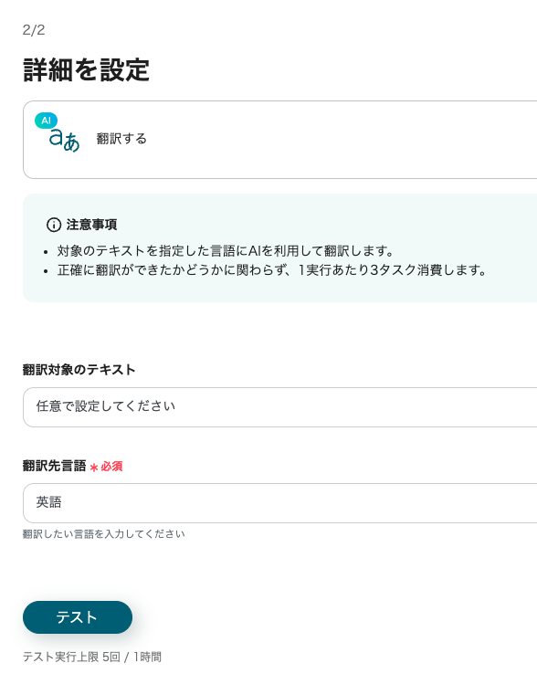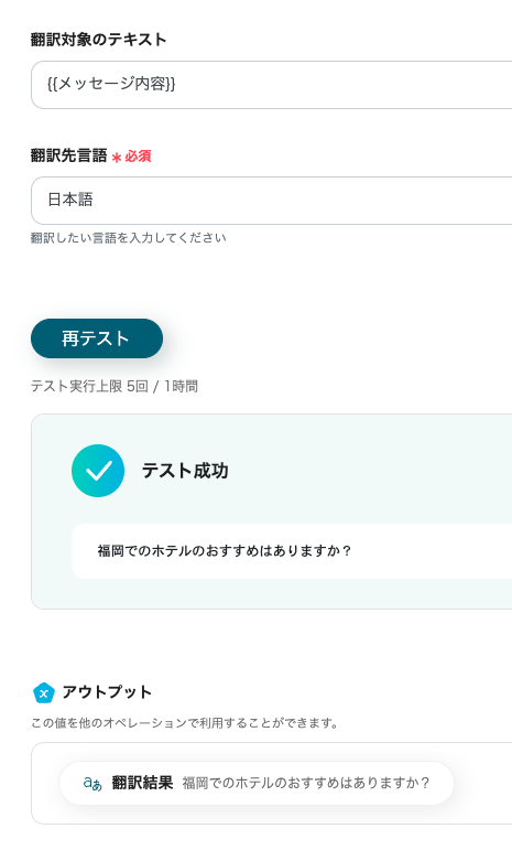 →テストをクリックする →成功 アウトプットでは日本語に翻訳された内容が抽出されました。