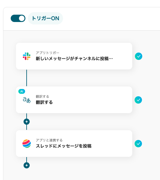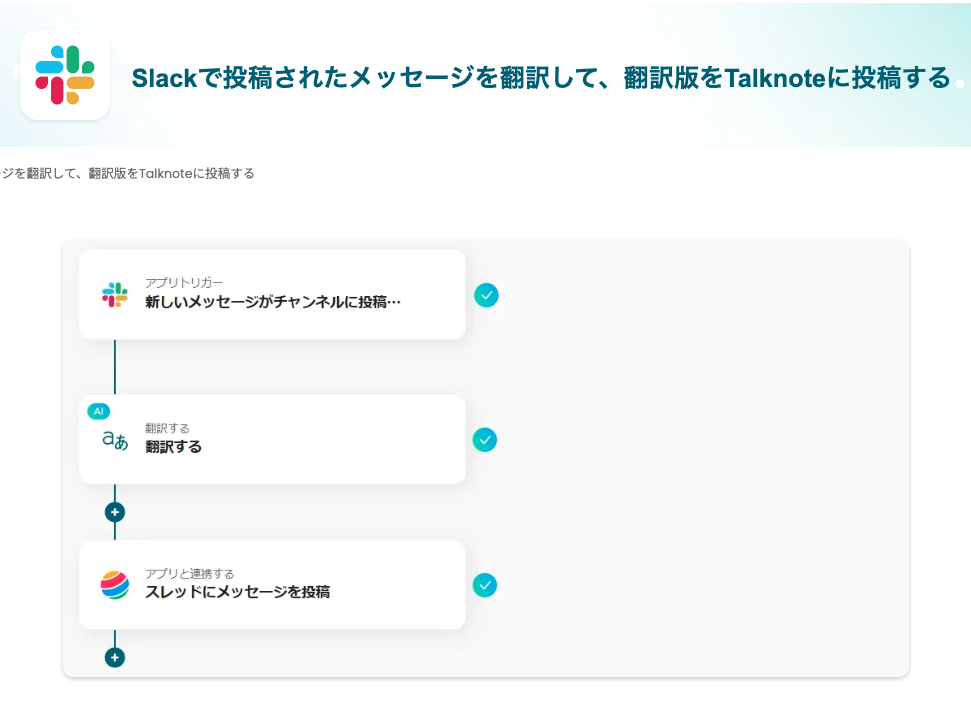 インバウンド需要の増加に伴い、旅行業界でのコミュニケーションは多言語化が進んできました。グローバルチームでSlackで活発な議論が行われている一方で、重要な情報をTalknoteに集約したい場合、手動での翻訳作業は大きな負担となっています。チームにとって、コミュニケーションの効率化は喫緊の課題と言えるでしょう。そこでYoomは、「Slackで投稿されたメッセージを翻訳して、翻訳版をTalknoteに投稿する」フローボットを作りました。この自動化を導入すると、手動での翻訳作業を減らし、チームのコミュニケーションの円滑化につながります。