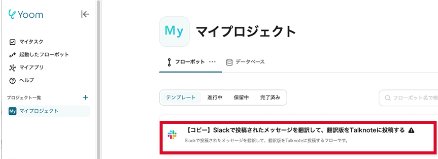 Yoomへご登録後、こちらのバナーをクリックします。Yoomワークスペースの「マイプロジェクト」にテンプレートがコピーされます。