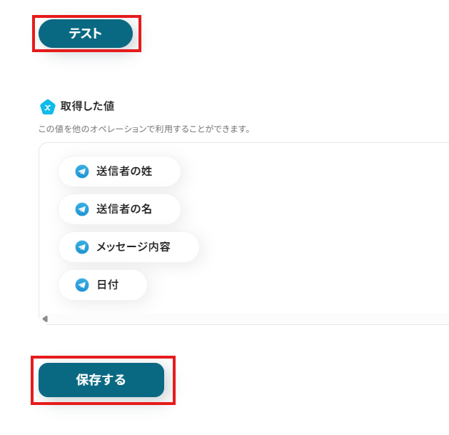 ※今回、Telegramのアウトプット(取得した値)が空白のため、メッセージ内容が表示されていませんが、値が入っていると表示されます。
