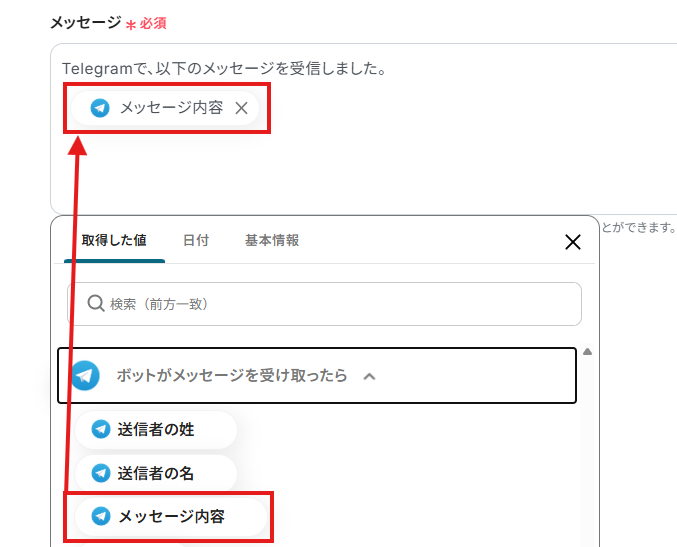 「メッセージ」は、入力欄をクリックして表示されるアウトプット(取得した値)から選択できます。