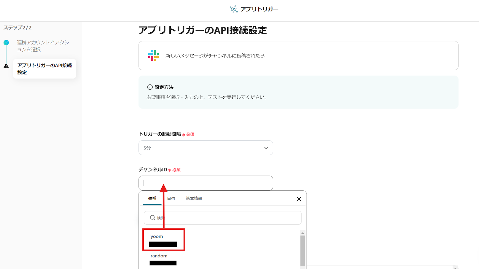 ワークスペースIDはSlackのチャンネル設定と同様で、ボックスをクリックすることで一覧表示されます。その中から選択しましょう。