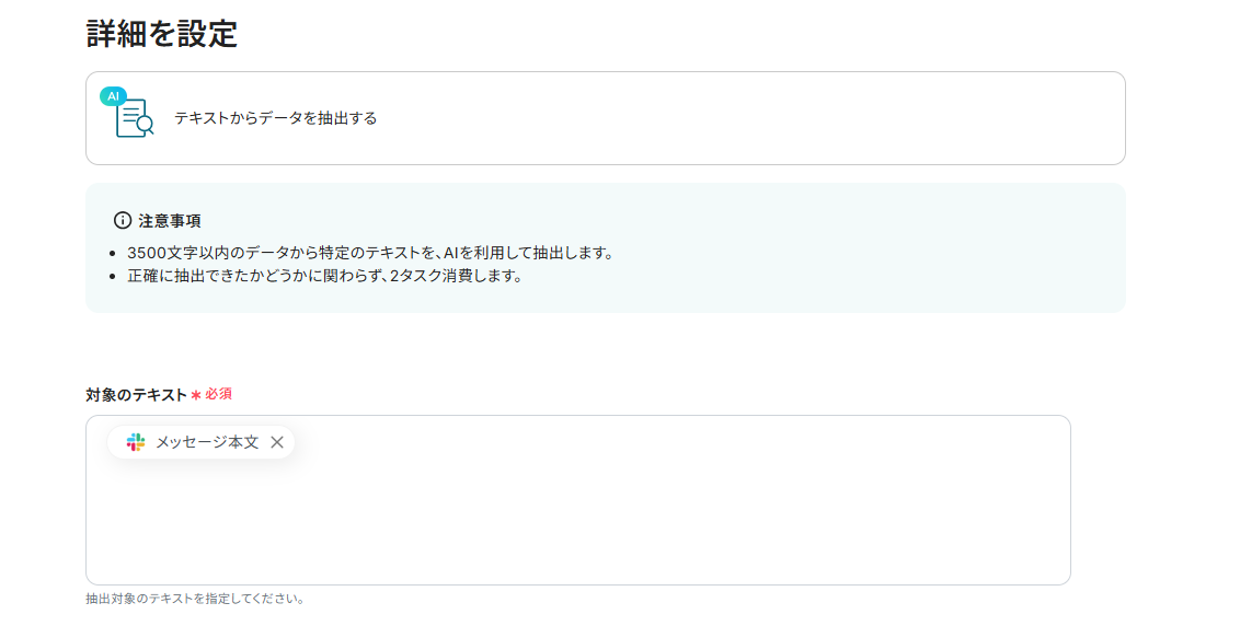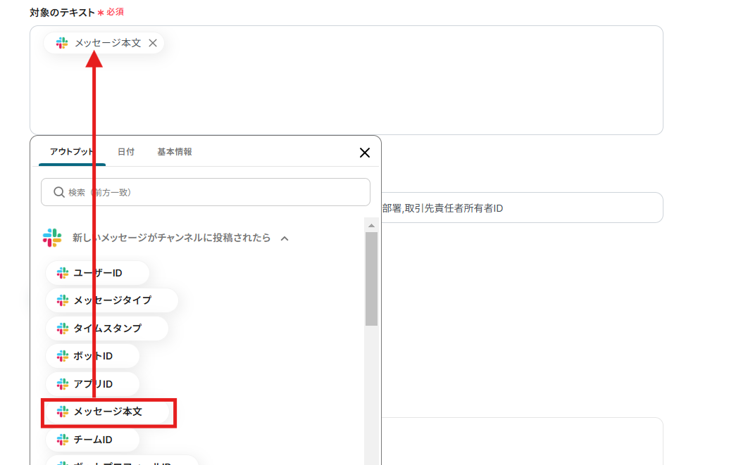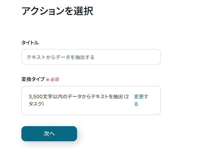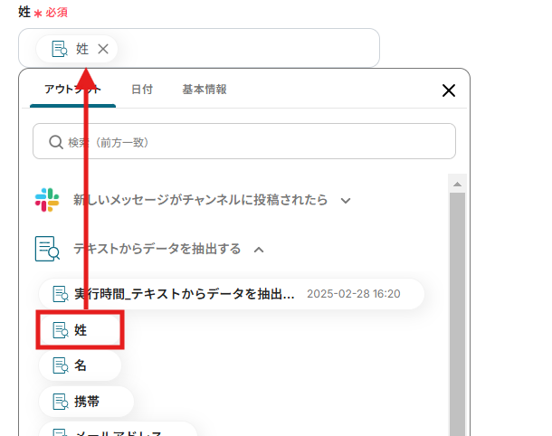 入力には、先ほどのデータ抽出アクションで取得したアウトプットを活用して入力しましょう。