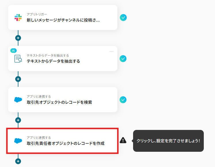 これで【Slackでメッセージが投稿されたらSalesforceに取引先責任者オブジェクトのレコードを作成する】というフローの完成です!