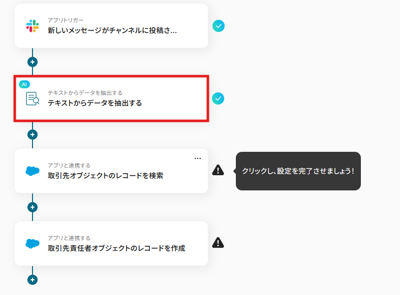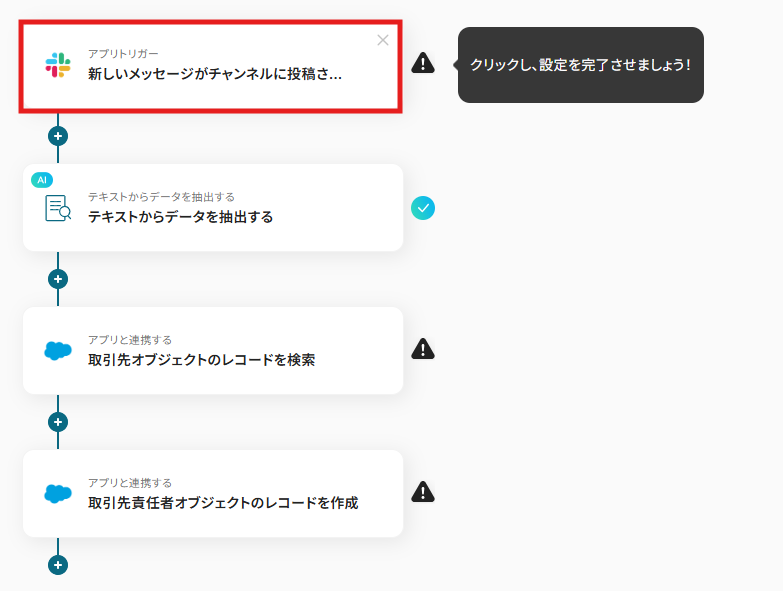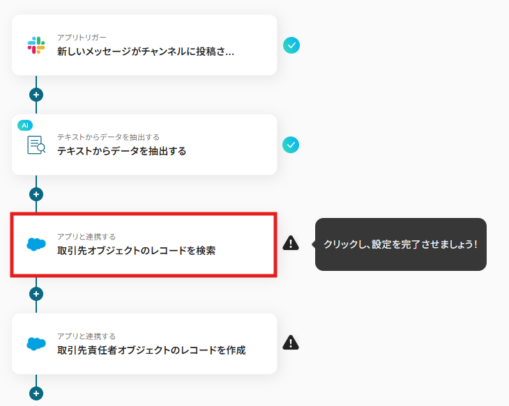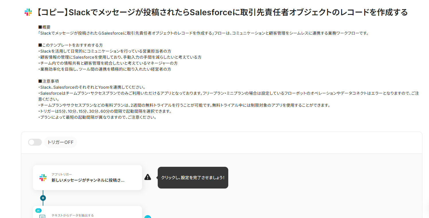 「Slackでメッセージが投稿されたらSalesforceに取引先責任者オブジェクトのレコードを作成する」フローは、コミュニケーションと顧客管理をシームレスに連携する業務ワークフローです。