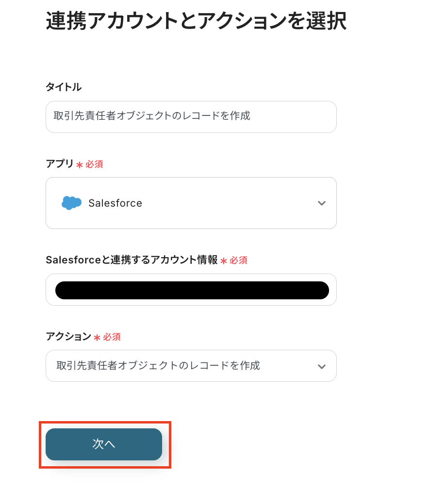 2) アクションは「取引先責任者オブジェクトのレコードを作成」を選択して、「次へ」をクリックします。