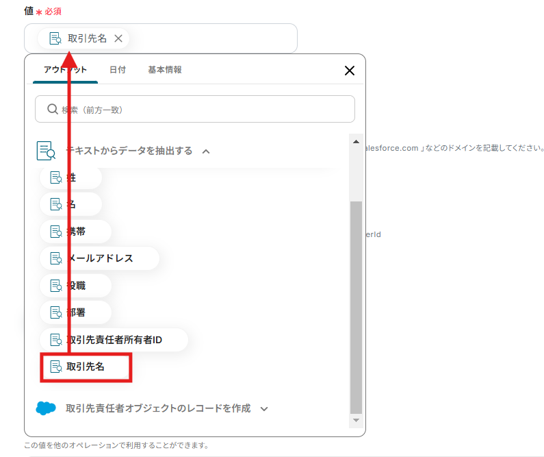 「値」欄には、先ほどテキスト抽出アクションで取得した「取引先名」を選択します。