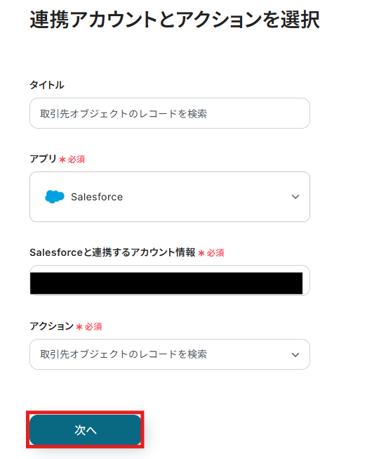 2) アクションは「取引先オブジェクトのレコードを検索」を選択して、「次へ」をクリックしてください。