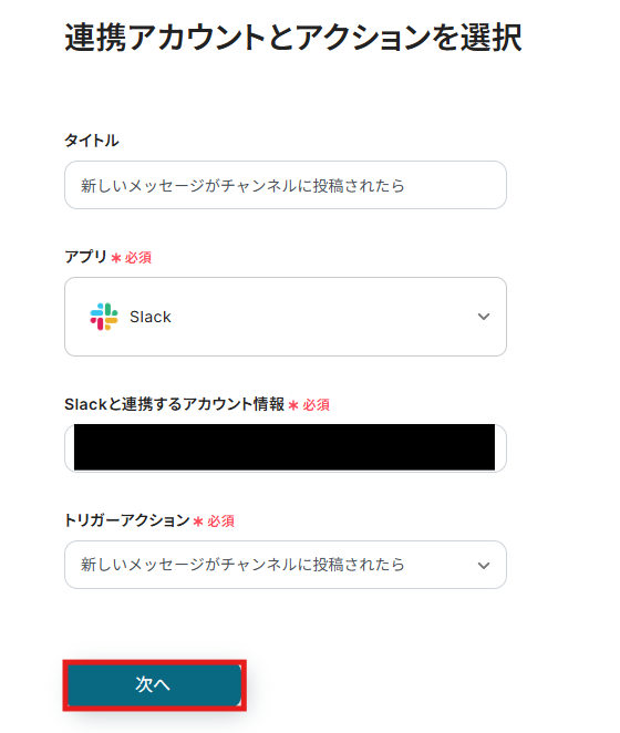 トリガーアクションは「新しいメッセージがチャンネルに投稿されたら」を選択し、「次へ」をクリックしてください。
