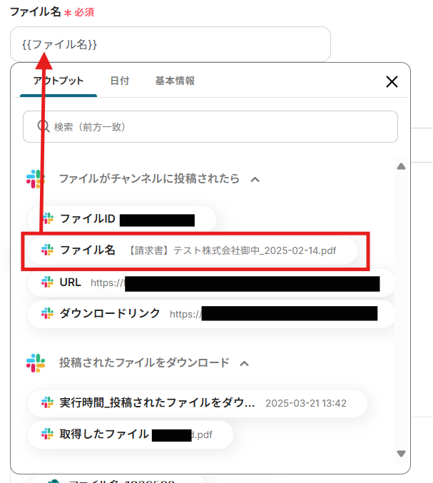 ファイル名の入力には先ほど取得したSlackのアウトプットを選択できます。