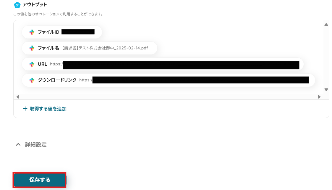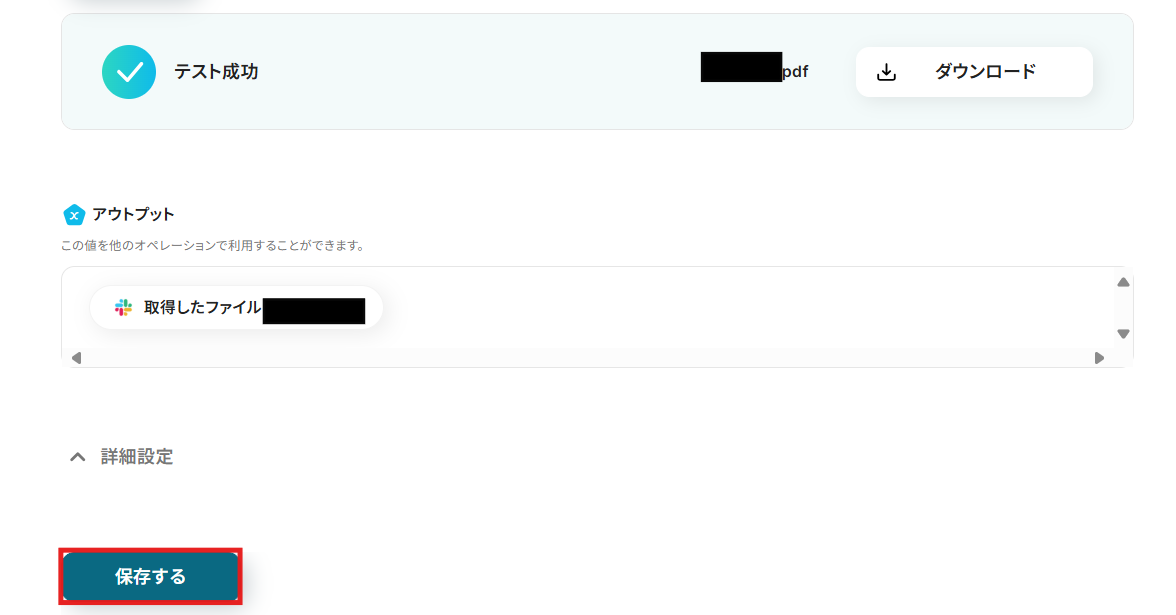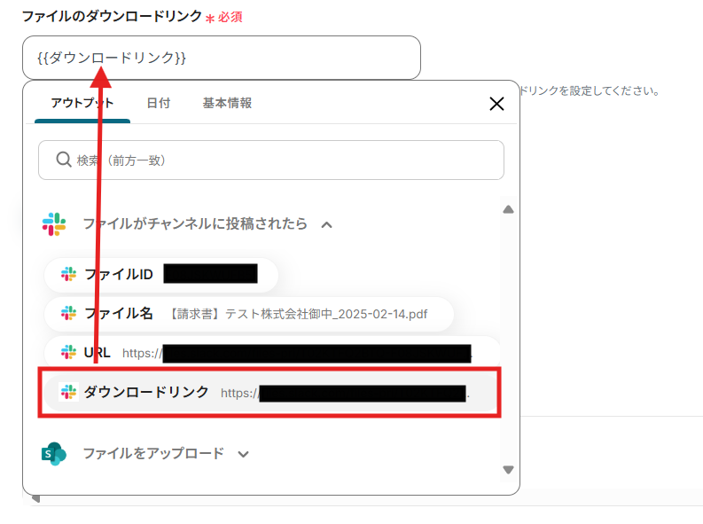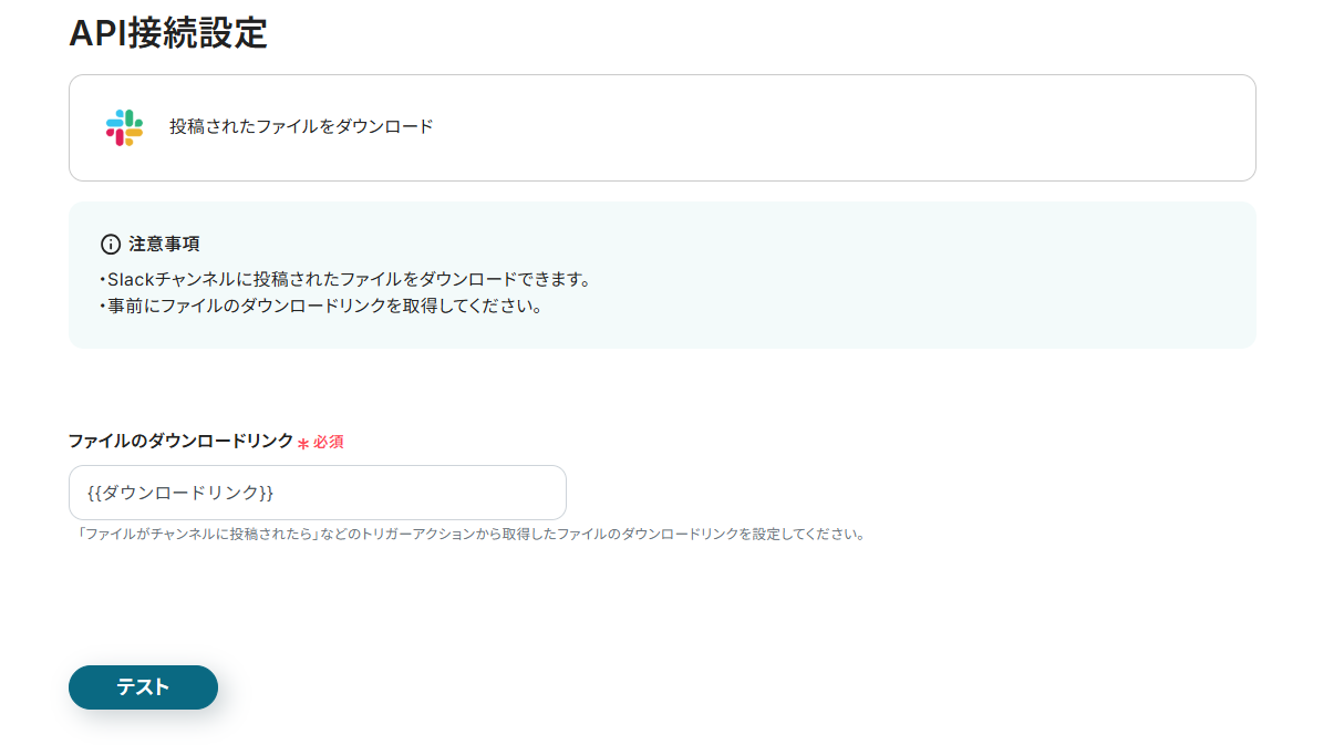 ファイルのダウンロードリンクの入力には先ほど取得したSlackのアウトプットを選択できます。