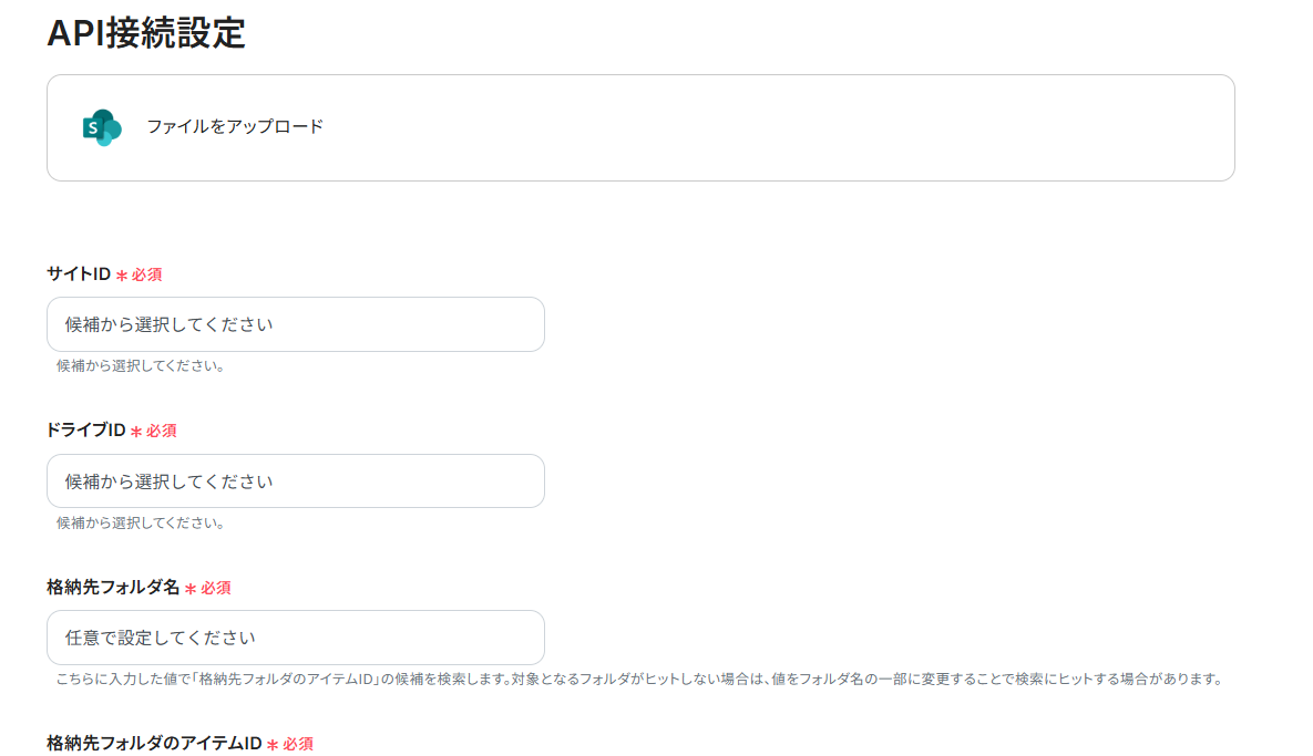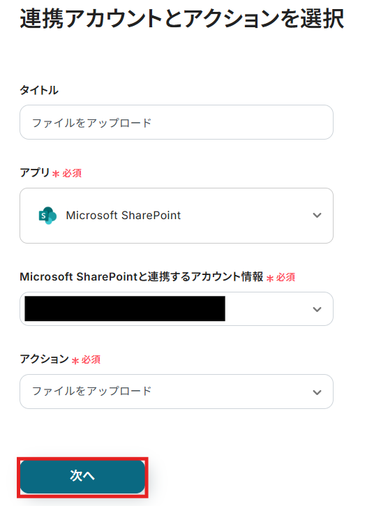 ステップ5:Microsoft SharePointにファイルをアップロードするアクションを設定