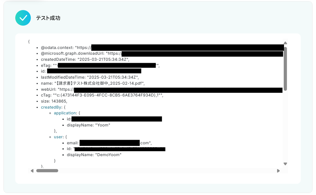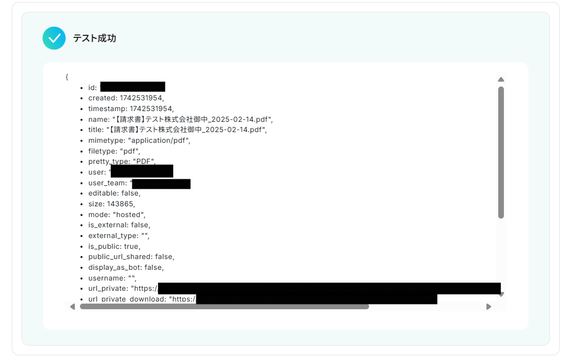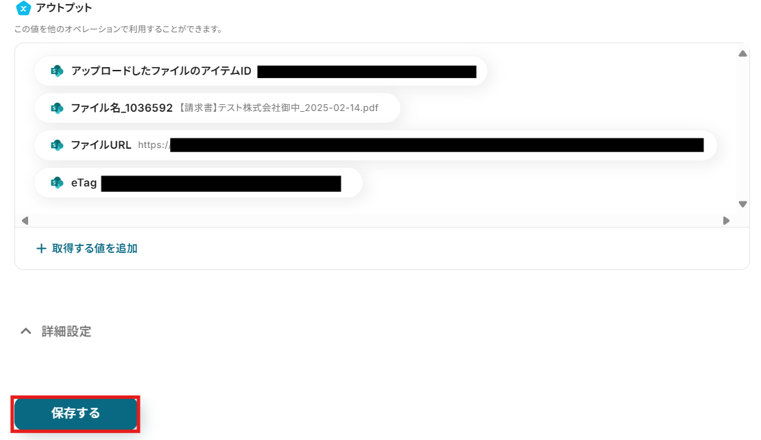 ファイルの添付方法は「アウトプットを使用する」、アウトプット名は「取得したファイル」になっていることを確認し、「テスト」をクリックします。