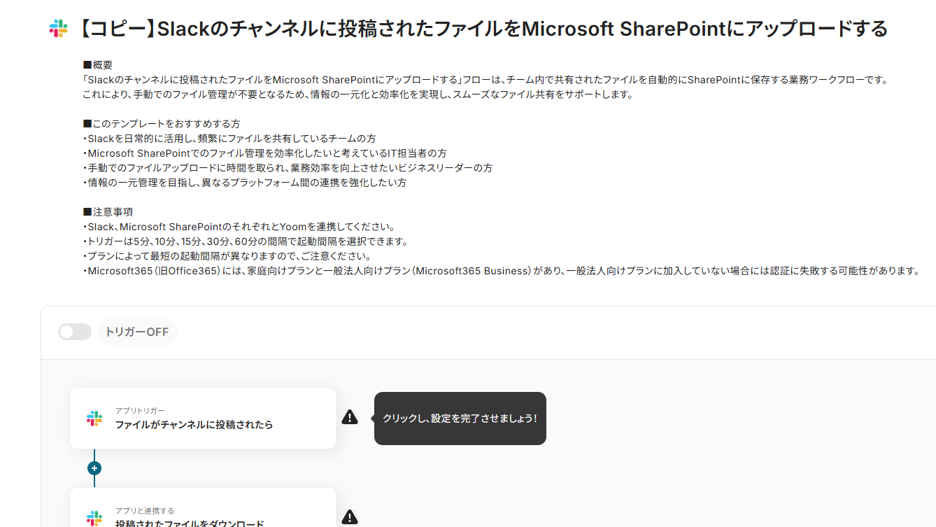 「Slackのチャンネルに投稿されたファイルをMicrosoft SharePointにアップロードする」フローは、チーム内で共有されたファイルを自動的にSharePointに保存する業務ワークフローです。