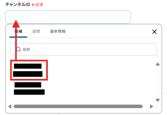 チャンネルIDはボックスをクリックすると連携済みのIDが表示されるので、使用したいIDを選択してください。