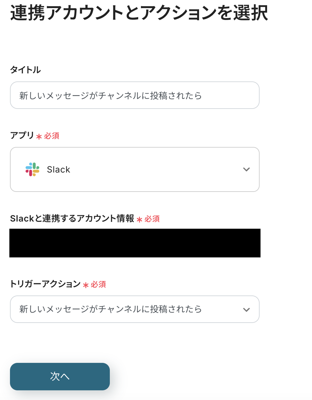 トリガーアクションは「新しくメッセージがチャンネルに投稿されたら」を選択し、次へをクリックします。