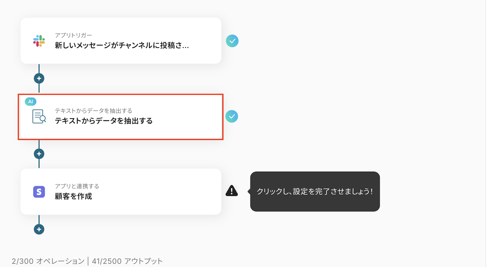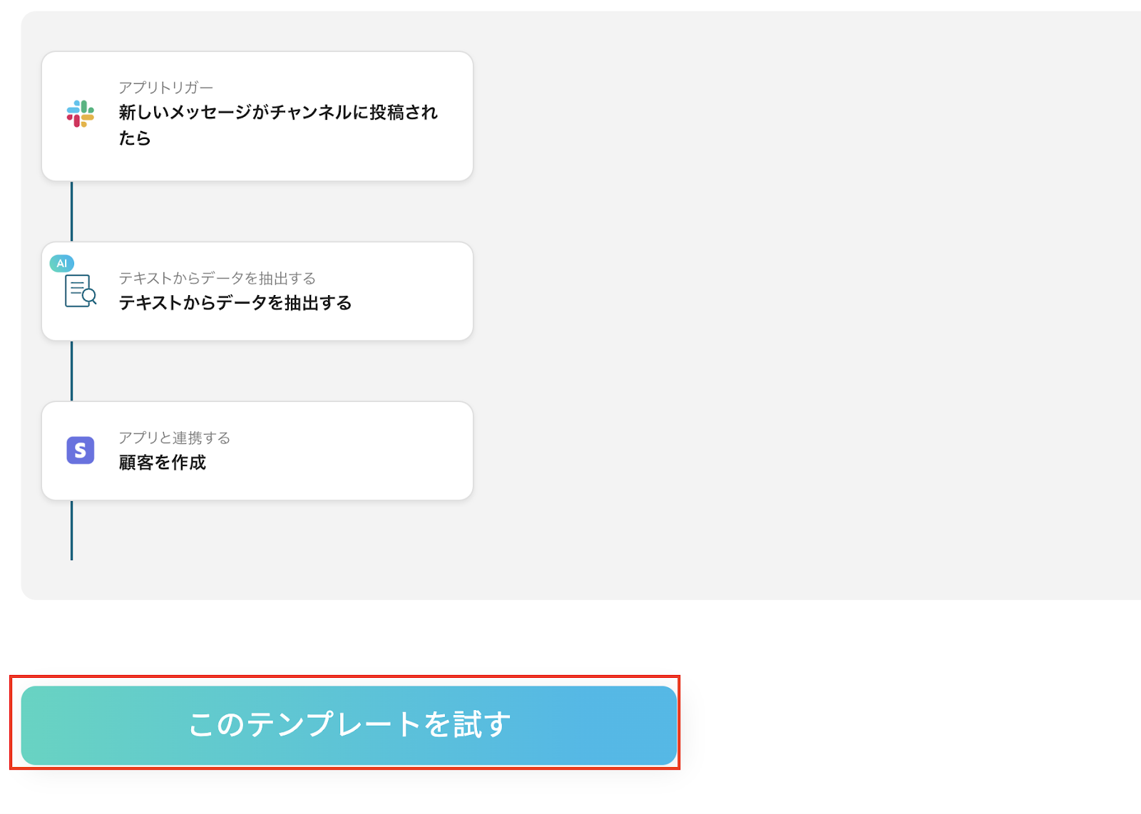 「Slackの投稿内容をもとにStripeで顧客を作成する」フローは、営業活動や顧客対応を効率化する業務ワークフローです。