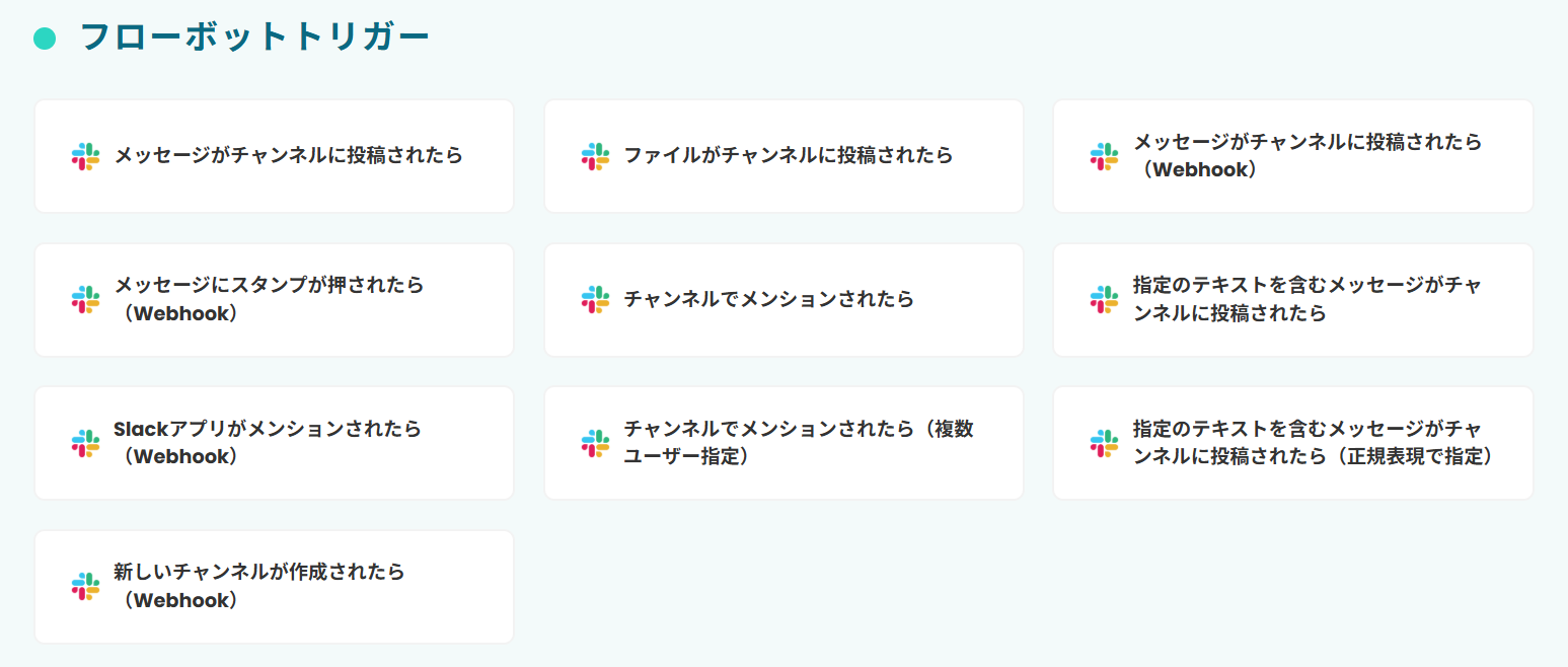 また、YoomでのSlackにおける自動化のトリガーには以下の内容を用意しています。このようにトリガーを変更するだけでも詳細なフローを作成可能です。