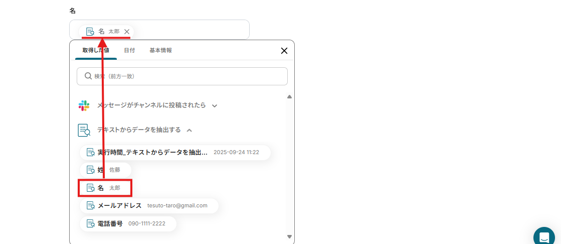 「名」は、Slackのメッセージから抽出した「名」の情報が自動で反映できるように設定されています。