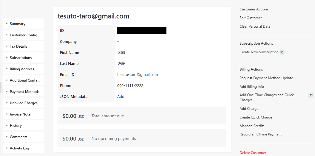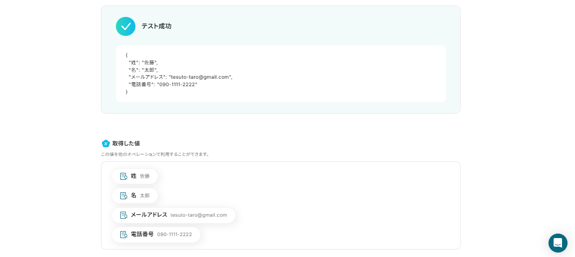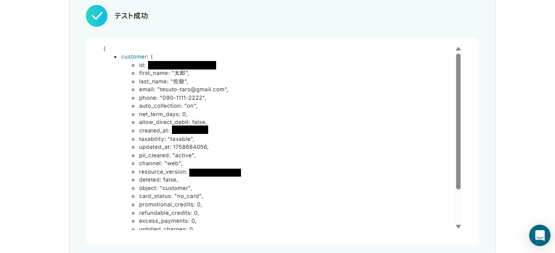 今回はChargebeeに顧客情報を自動追加したいため、架空の顧客の氏名・メールアドレス・電話番号を送信してみました!