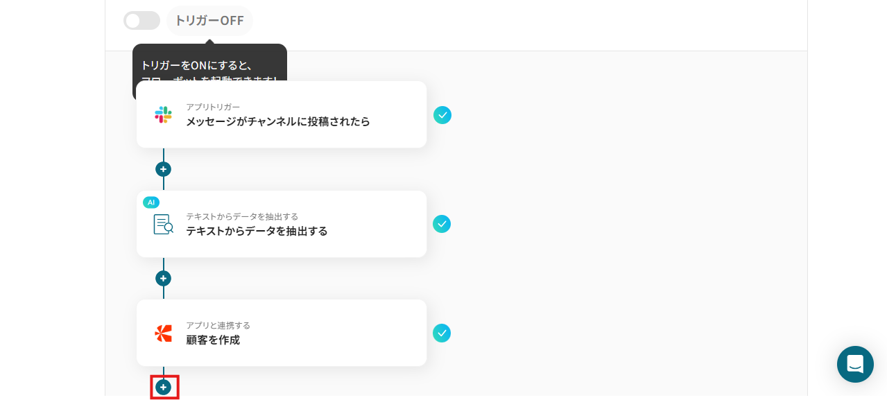 Slackで共有した顧客に関するメッセージをトリガーに、AIでテキスト情報から顧客名や連絡先などを抽出し、Chargebeeに新しい顧客として登録するフローです。