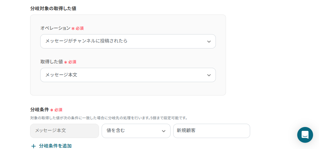 A:トリガーアクションの「メッセージがチャンネルに投稿されたら」の下にある+ボタンをクリックし、「分岐」のアクションを追加することで、全てのメッセージに反応することなく、より細かい条件で連携可能です。