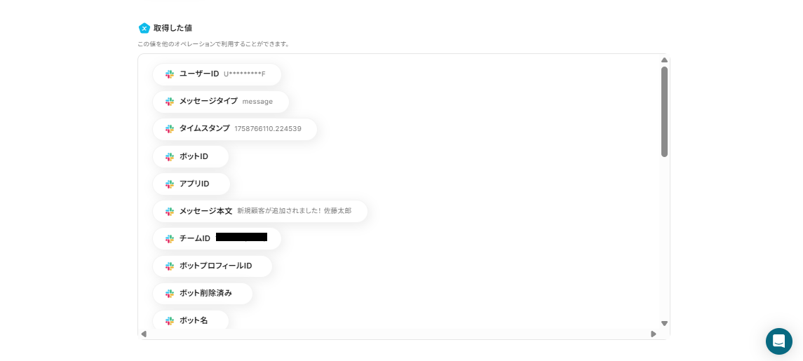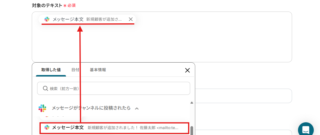 このように取得した値を活用して設定を行うことで、Slackに送信されたメッセージの本文を自動で取得し、抽出対象のテキストとして指定することが可能です。