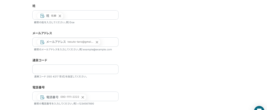 今回は、Chargebeeの顧客を自動で登録したいため、「姓,名,メールアドレス,電話番号」と設定しました。もちろん任意で設定可能です。