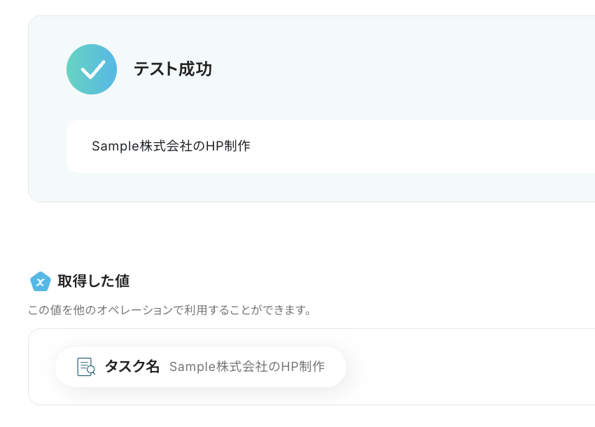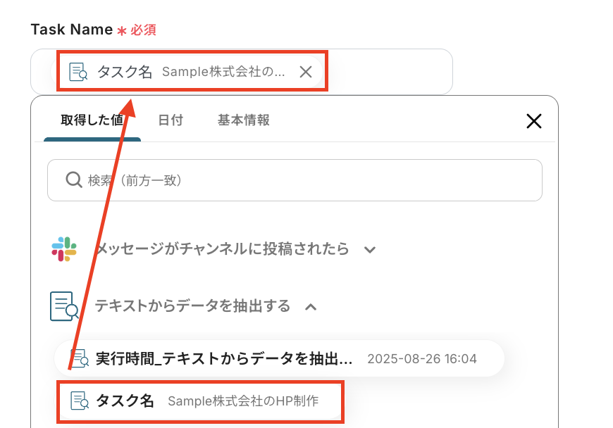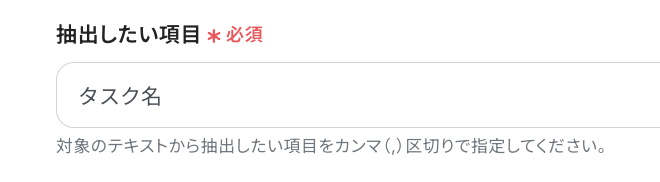 たとえば「タスク名,顧客名,期日」などと抽出したい項目を指定し、「”顧客名_タスク名”といった形式でタスク名を生成してください。例:テスト株式会社_HPデザイン制作」など明確な指示を「指示内容」に入力することで、より意図に近い結果が得られるでしょう。