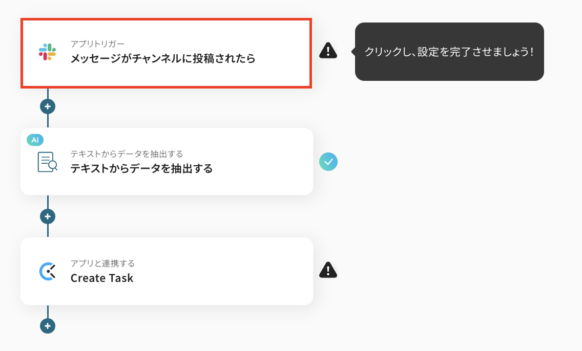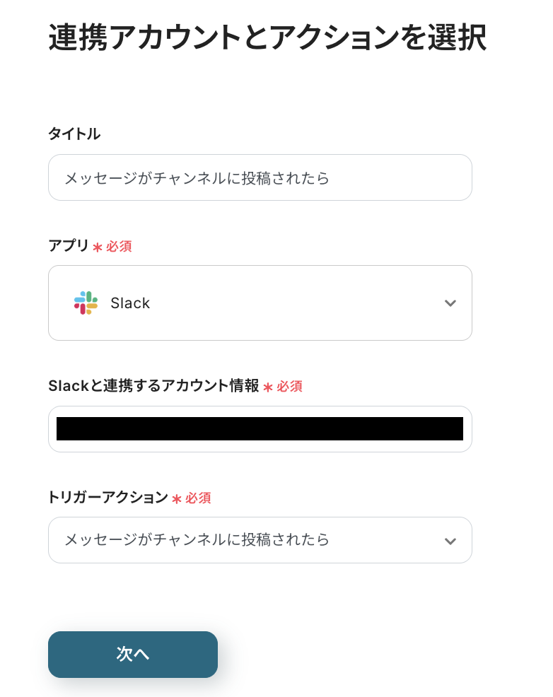 まずは、指定のSlackチャンネルにメッセージが投稿された際に、フローが起動するように設定を行います。