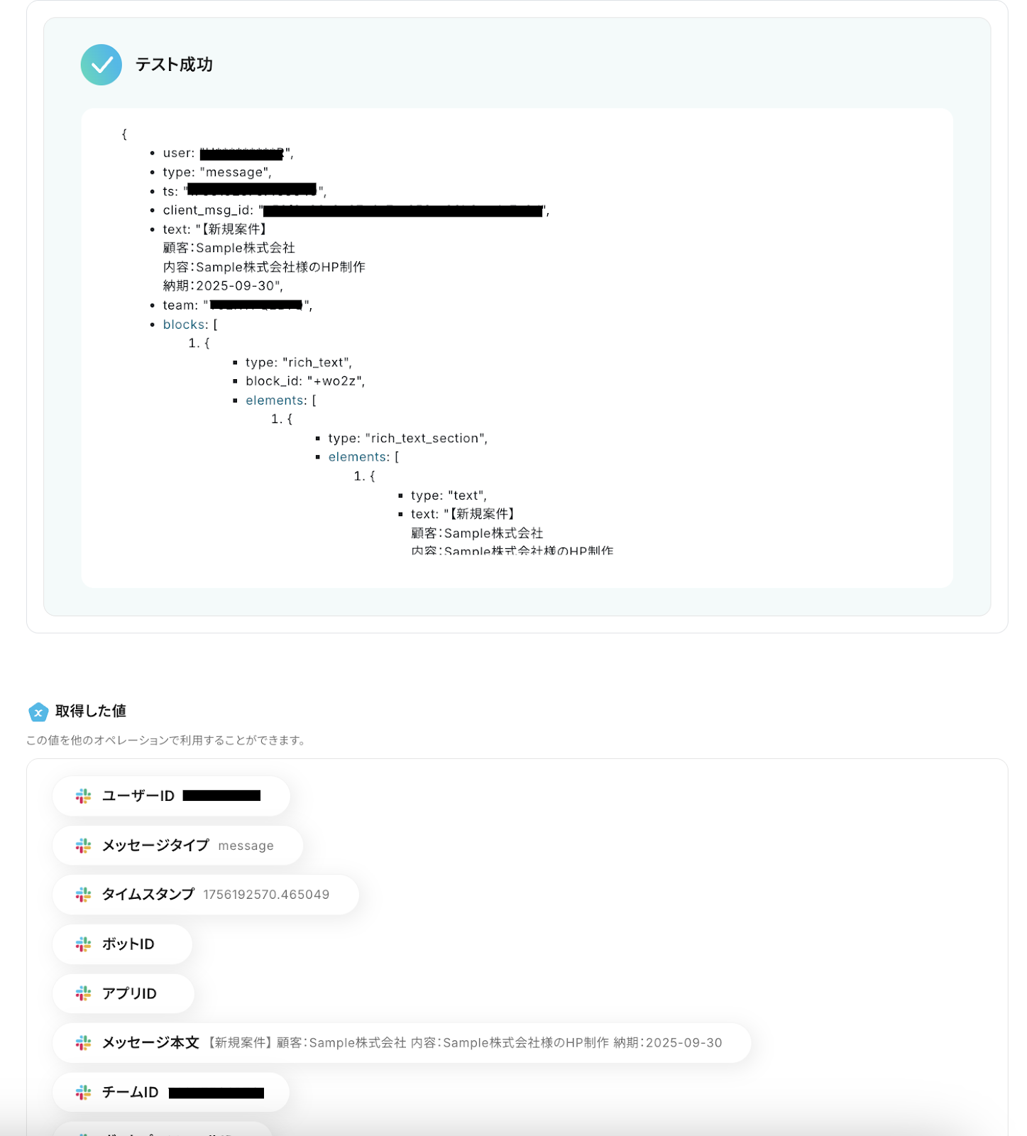 テストが成功すると、先ほど投稿したメッセージの情報が「取得した値」にアウトプットとして抽出されるので、内容を確認しましょう。