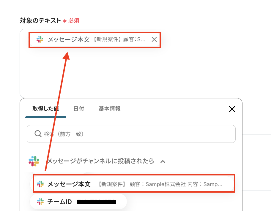 対象のテキスト:データを抽出する対象となるテキストを、アウトプットを使って設定します。