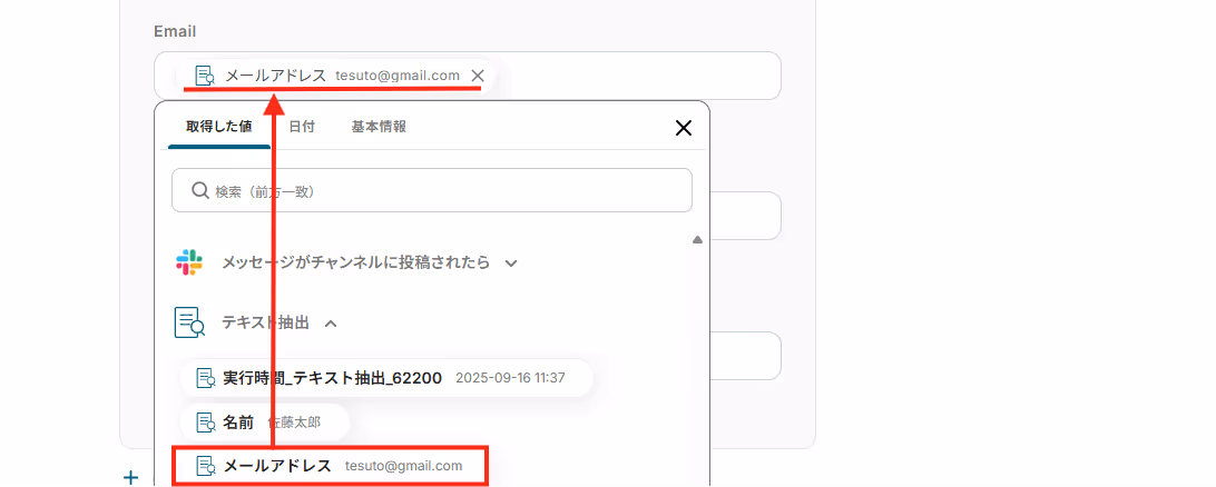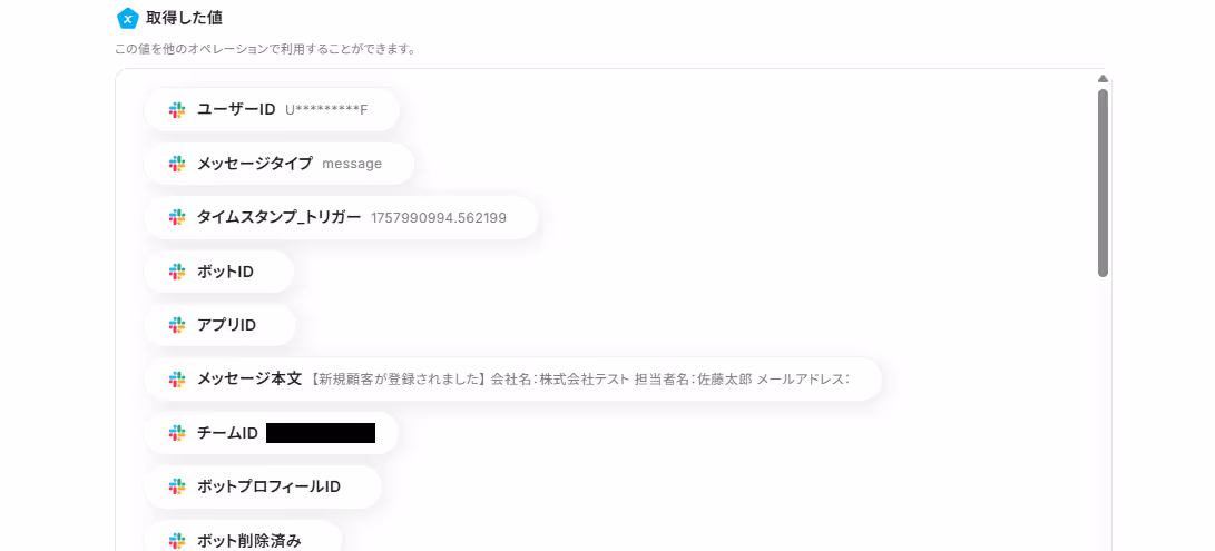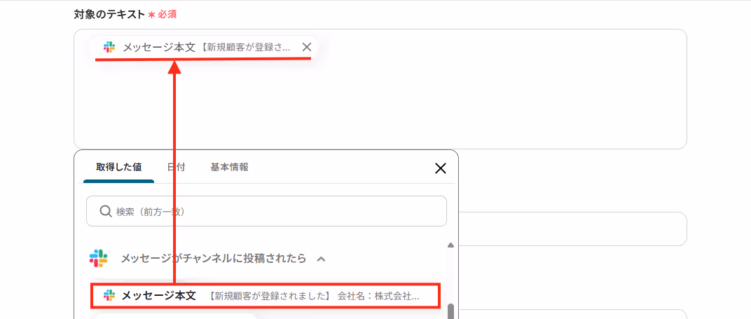 このように設定することで、Slackで投稿されたメッセージ内容を自動で取得し、抽出対象のテキストとして指定できます。