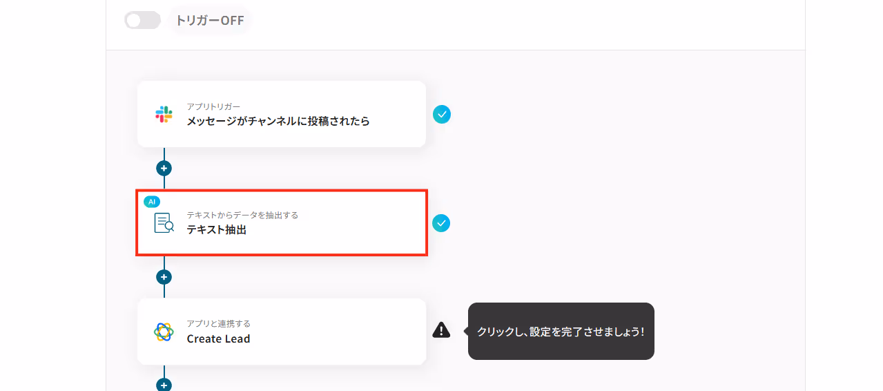 続いて、AI機能を活用してSlackのメッセージからCloseに登録したいデータを抽出する設定を行います。
