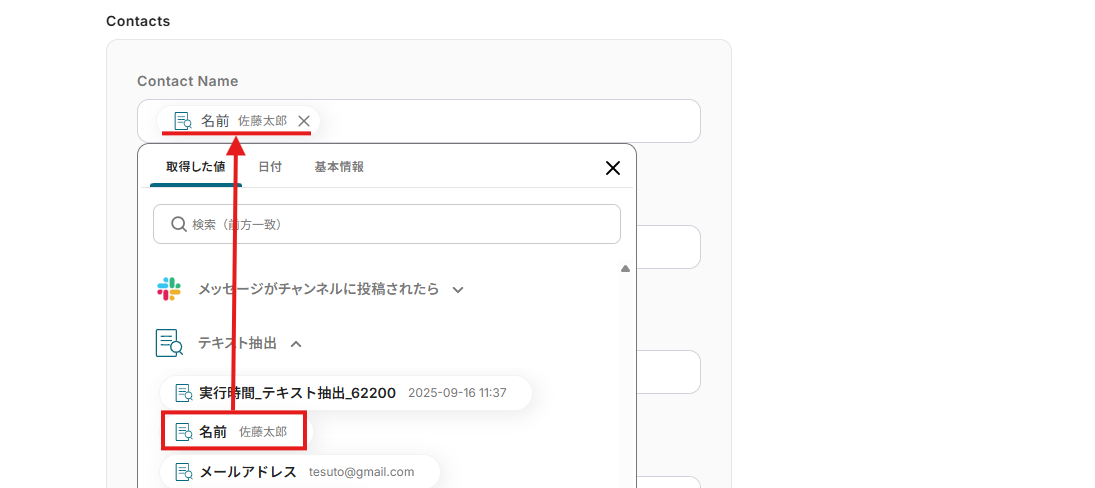 Contact NameとEmailもSlackのメッセージから抽出した情報が自動で引用できるように設定してあります。