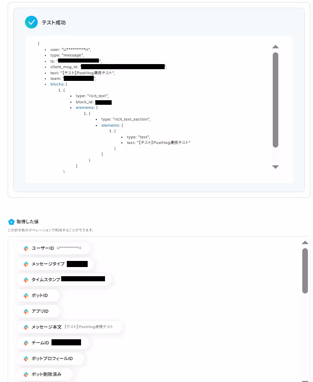 「テスト成功」の文字とリクエスト内容がJSON PATHで表記され、共に「取得した値」として、Slackに送信したメッセージの内容が反映されていれば成功です!