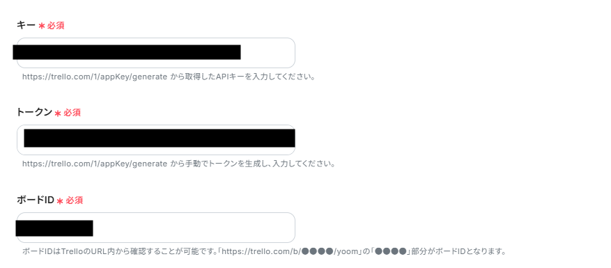• Trelloの「カードが新たに作成されたら(Webhook)」トリガーでは、連携するTrelloアカウントのユーザー名、そして自動化の対象としたいボードのIDを任意で設定してください。