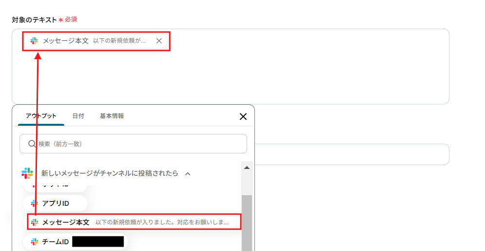 3. 次に、オペレーションでAI機能を設定し、Slackのメッセージ本文からタスク名や担当者、期限などの情報を抽出します。