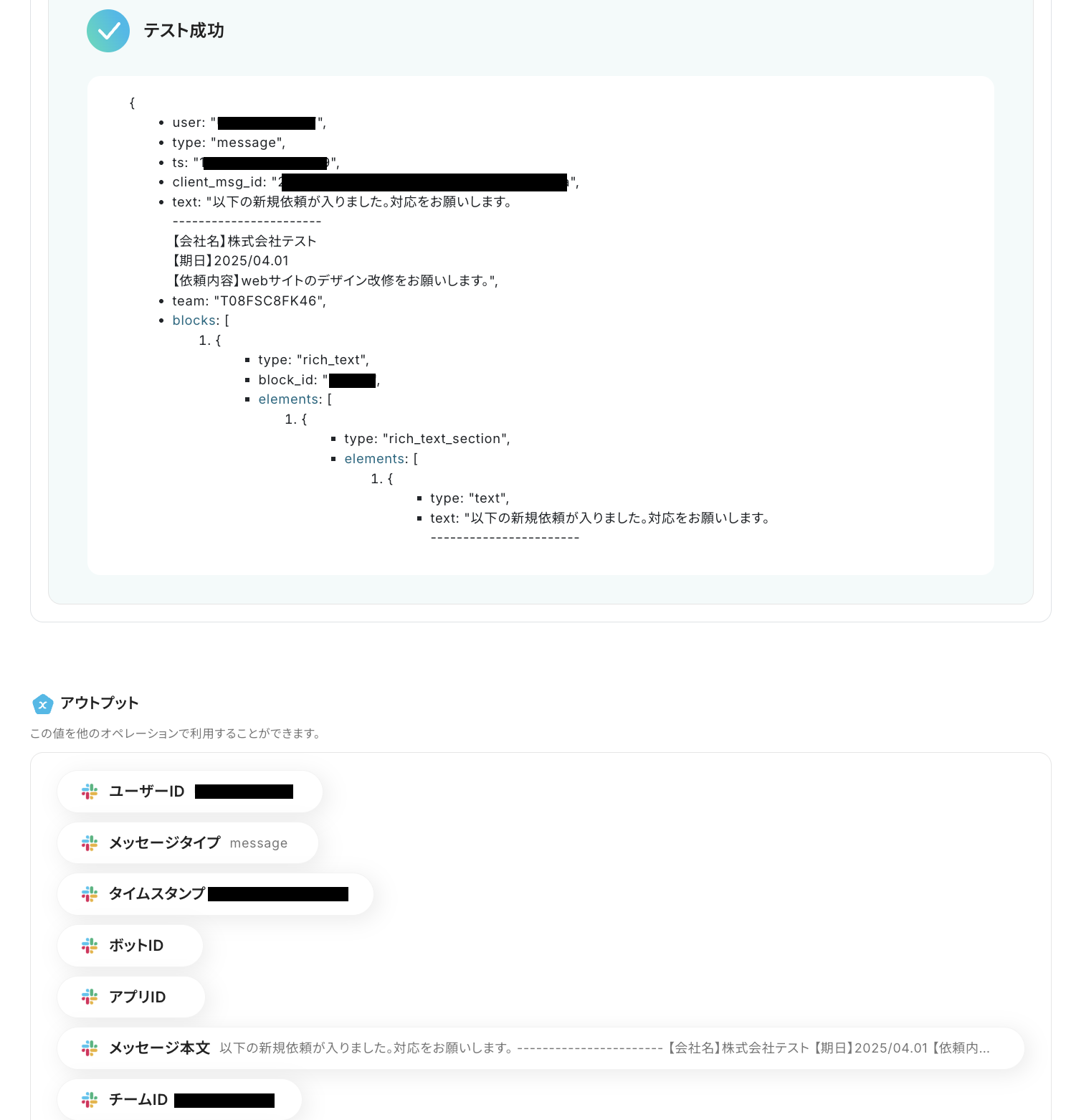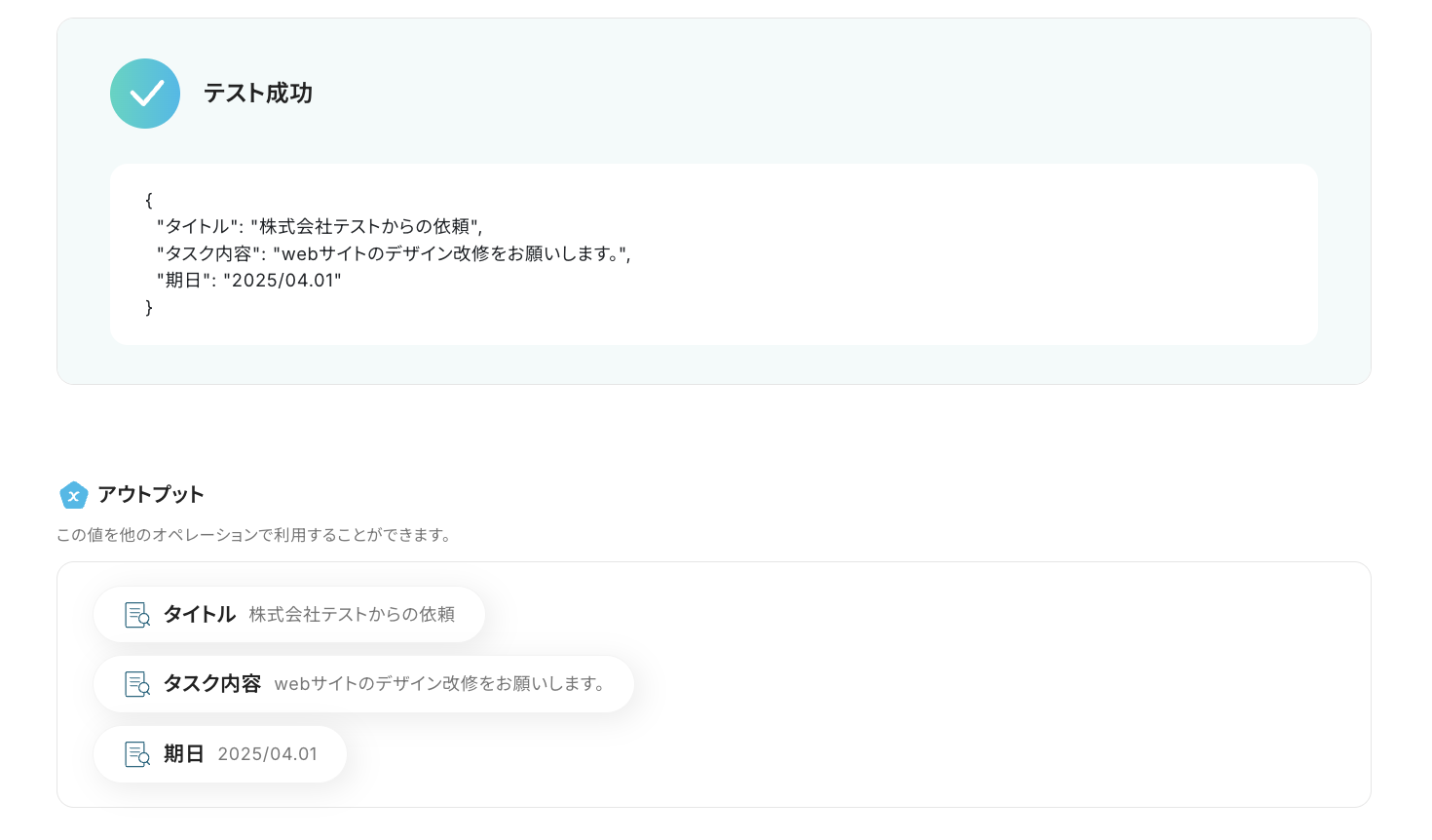 設定完了後、「テスト」を実行し、正しくアウトプットが取得されることを確認します。