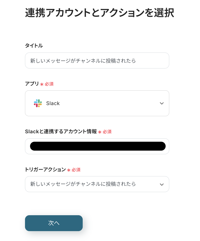 「連携するアカウント情報」にはステップ1でマイアプリ登録した際の情報が記載されます。トリガーアクションはそのままにし、「次へ」をクリックしましょう。